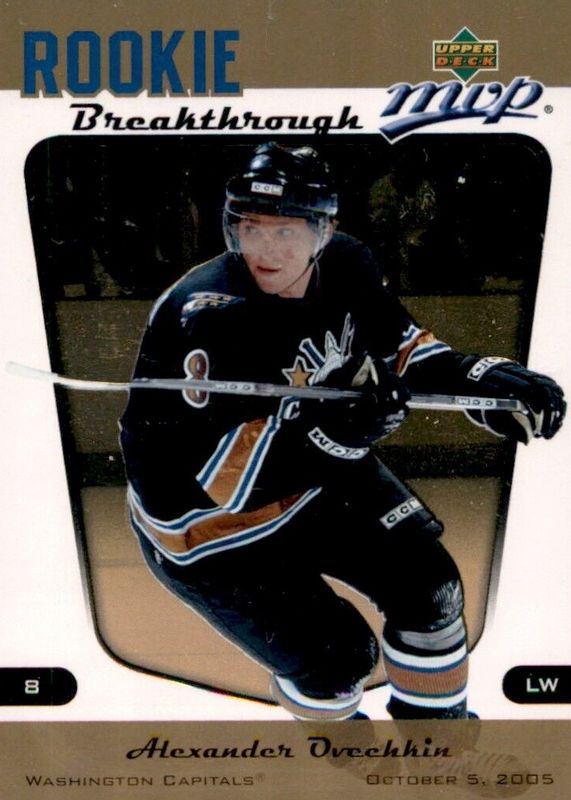 The Alexander Ovechkin 2005 Upper Deck MVP #RB2 Rookie Breakthrough card in Raw condition has moved down -$14.89 (-66.3%) in the last 30 days and was last sold for $7.57 .