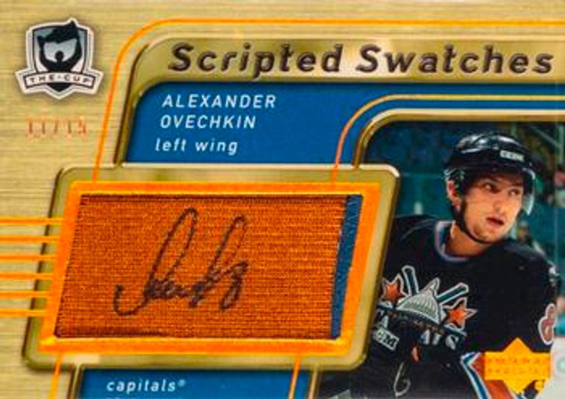 The Alexander Ovechkin 2005 Upper Deck The Cup #SS-AO Scripted Swatches /25 Rookie card is 1 of 46 Alexander Ovechkin's card variations in the 2005 Upper Deck The Cup set being tracked by Sports Card Investor, including Base /199, Platinum Rookies /25, Black Rainbow /1, Printing Plates UD PowerPlay Black, and Printing Plates UD PowerPlay Cyan.