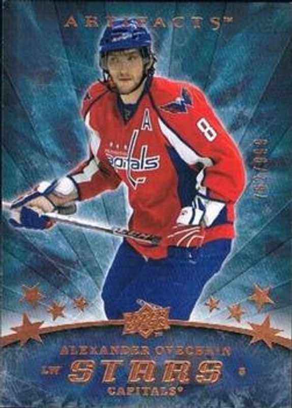 The Alexander Ovechkin 2008 Upper Deck Artifacts #151 Base /999 card is 1 of 42 Alexander Ovechkin's card variations in the 2008 Upper Deck Artifacts set being tracked by Sports Card Investor, including #1 Base /999, #1 Gold /75, #1 Blue /50, #151 Blue /50, and #151 Copper Spectrum /25.