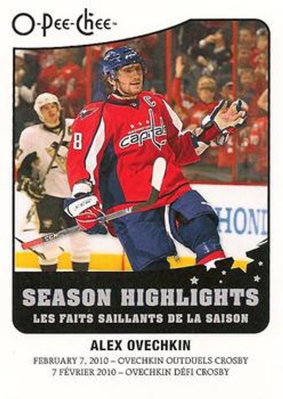 The Alexander Ovechkin 2010 O-Pee-Chee #SH-2 Season Highlights card is 1 of 13 Alexander Ovechkin's card variations in the 2010 O-Pee-Chee set being tracked by Sports Card Investor, including Base, Retro, Retro Blank Back, Retro Rainbow, and Retro Black Rainbow /100.