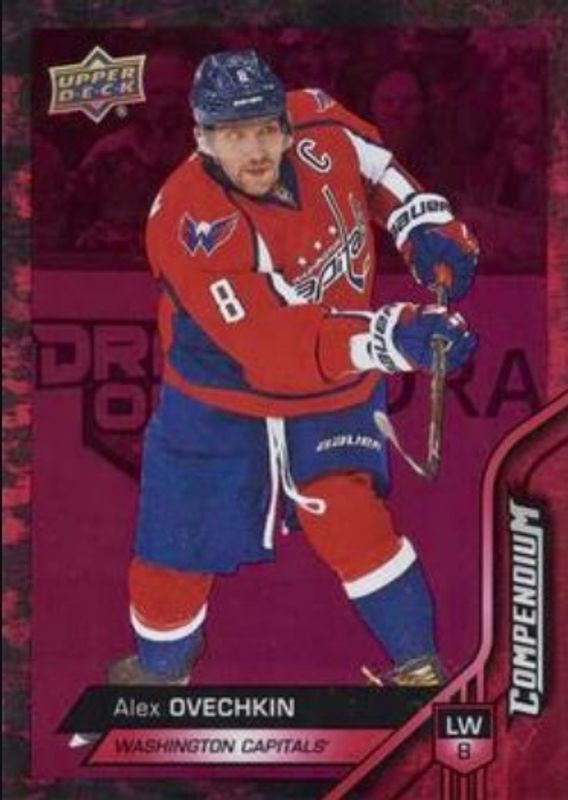 The Alexander Ovechkin 2016 Upper Deck Compendium #SP-5 SP Achievement Magenta card is 1 of 12 Alexander Ovechkin's card variations in the 2016 Upper Deck Compendium set being tracked by Sports Card Investor, including Blue, Gold, Red, Printing Plates Black /1, and Printing Plates Cyan /1.