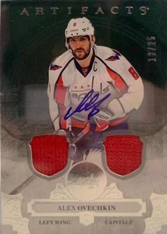 The Alexander Ovechkin 2017 Upper Deck Artifacts #122 Auto Material Silver /99 card is 1 of 13 Alexander Ovechkin's card variations in the 2017 Upper Deck Artifacts set being tracked by Sports Card Investor, including Base /799, Materials Silver /125, Orange /55, Auto Material Emerald /25, and Materials Emerald /25.