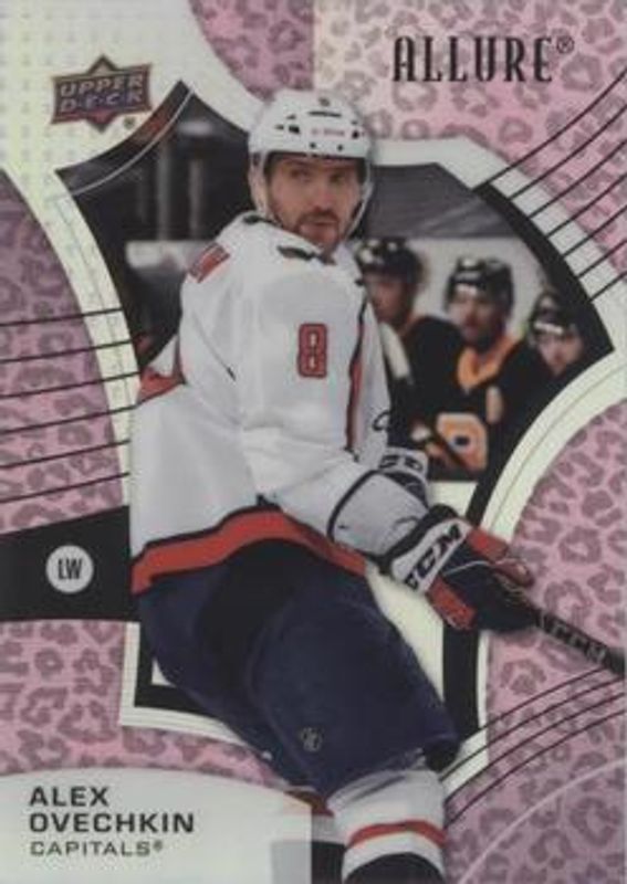 The Alexander Ovechkin 2021 Upper Deck Allure #43 Pink Blue Leopard card is 1 of 40 Alexander Ovechkin's card variations in the 2021 Upper Deck Allure set being tracked by Sports Card Investor, including Base, Black Rainbow, Blue China, Orange Slice die-cut, and Red Rainbow.