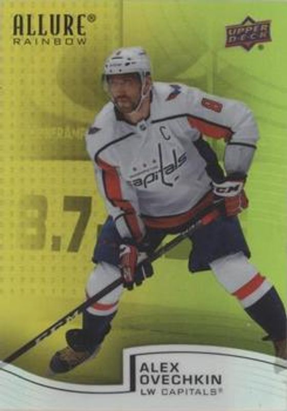 The Alexander Ovechkin 2021 Upper Deck Allure #R-100 Rainbow Yellow - Green card is 1 of 40 Alexander Ovechkin's card variations in the 2021 Upper Deck Allure set being tracked by Sports Card Investor, including Base, Black Rainbow, Blue China, Orange Slice die-cut, and Pink Blue Leopard.