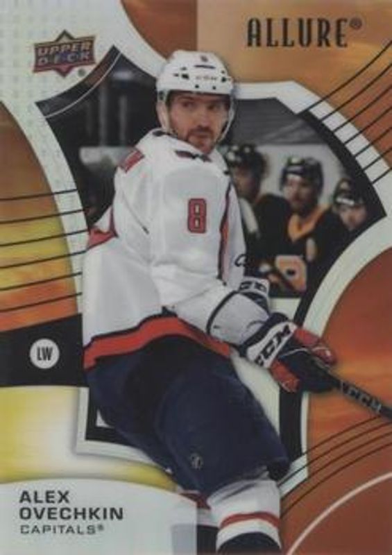 The Alexander Ovechkin 2021 Upper Deck Allure #43 Sunrise card is 1 of 40 Alexander Ovechkin's card variations in the 2021 Upper Deck Allure set being tracked by Sports Card Investor, including Base, Black Rainbow, Blue China, Orange Slice die-cut, and Pink Blue Leopard.