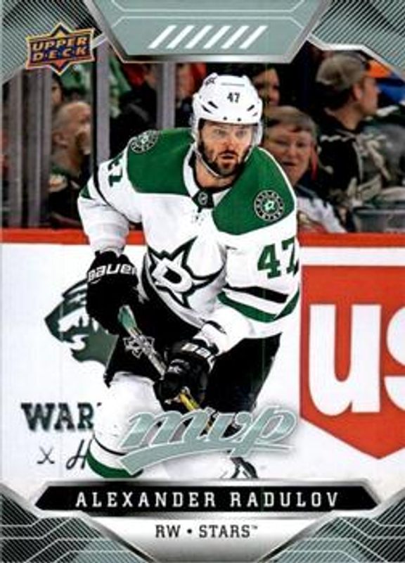 The Alexander Radulov 2019 Upper Deck MVP #81 Base card is 1 of 16 Alexander Radulov's card variations in the 2019 Upper Deck MVP set being tracked by Sports Card Investor, including Blue, Gold Script, Puzzle Backs, Silver Script, and Super Script /25.