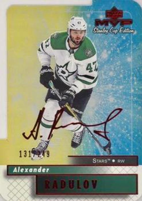 The Alexander Radulov 2019 Upper Deck MVP #81 Stanley Cup Edition 20th Anniversary Colors & Contours /249 card is 1 of 16 Alexander Radulov's card variations in the 2019 Upper Deck MVP set being tracked by Sports Card Investor, including Base, Blue, Gold Script, Puzzle Backs, and Silver Script.