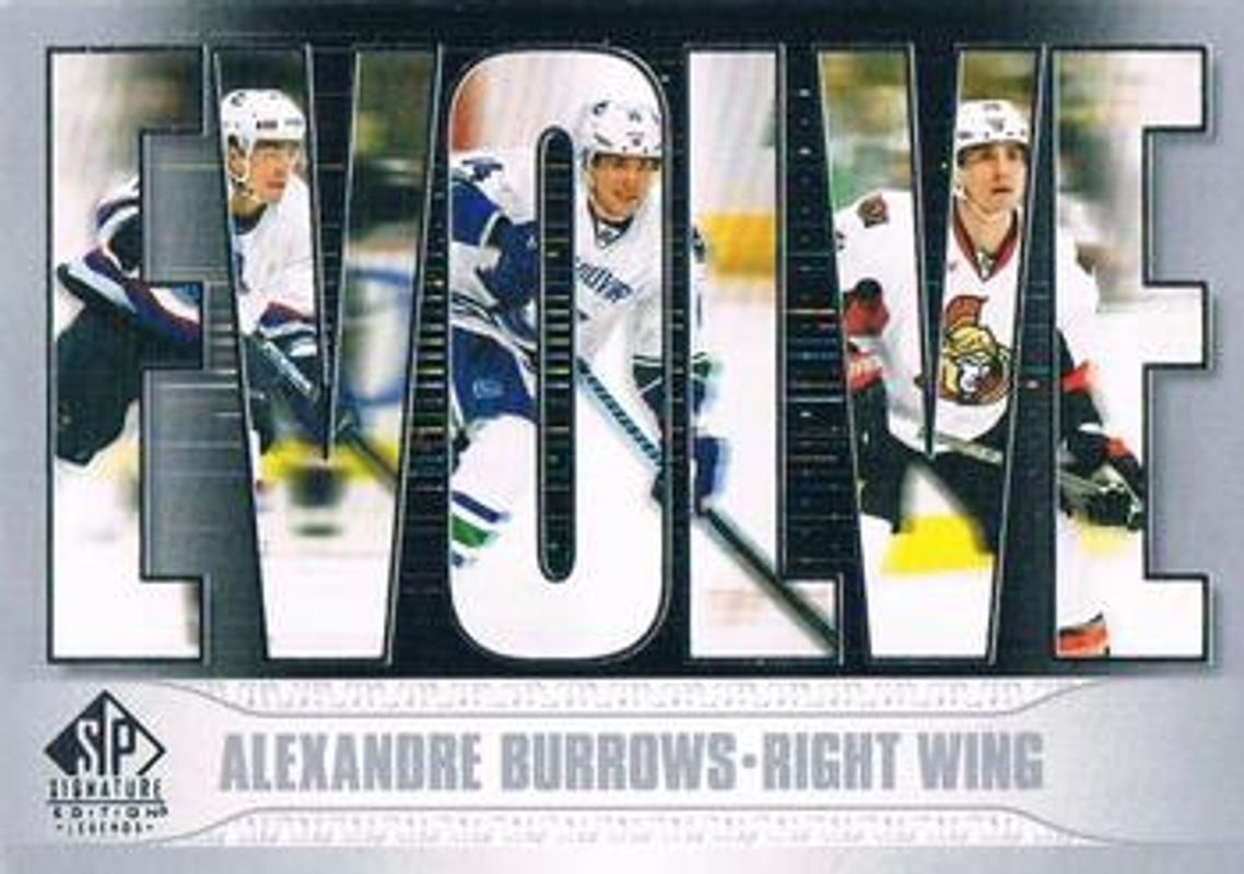 The Alexandre Burrows 2020 SP Signature Edition Legends #E-34 Evolve card is 1 of 15 Alexandre Burrows' card variations in the 2020 SP Signature Edition Legends set being tracked by Sports Card Investor, including Base /99, Gold Foil, Gold Spectrum Foil Autographs /25, Black /10, and Behind the Boards.