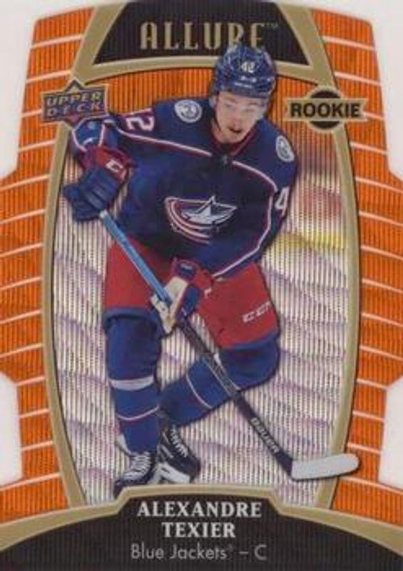 The Alexandre Texier 2019 Upper Deck Allure #71 Orange Slice /199 Rookie card is 1 of 40 Alexandre Texier's card variations in the 2019 Upper Deck Allure set being tracked by Sports Card Investor, including #132 Base, #71 Base, #71 Pewter, #132 Pink Diamond, and #71 Red Rainbow.