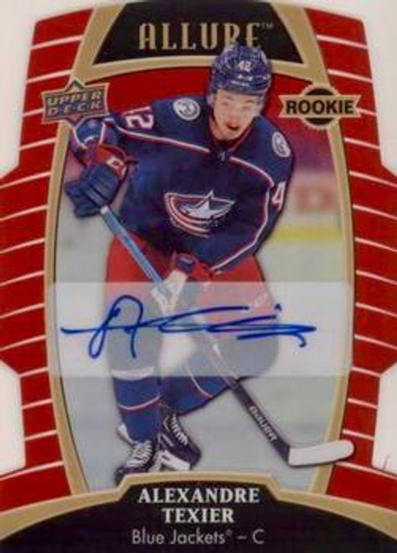 The Alexandre Texier 2019 Upper Deck Allure #71 Red Rainbow Autographs /349 Rookie card is 1 of 40 Alexandre Texier's card variations in the 2019 Upper Deck Allure set being tracked by Sports Card Investor, including #132 Base, #71 Base, #71 Pewter, #132 Pink Diamond, and #71 Red Rainbow.
