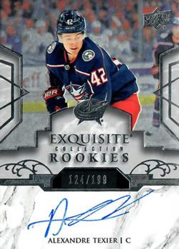 The Alexandre Texier 2019 Upper Deck Ice #R15 Exquisite Collection Platinum Rookies Signatures /199 card is 1 of 24 Alexandre Texier's card variations in the 2019 Upper Deck Ice set being tracked by Sports Card Investor, including Base /499, Black /1, Ice Premieres - Jersey Relics, Sub Zero Rookies Blue Auto, and Sub Zero Rookies /999.