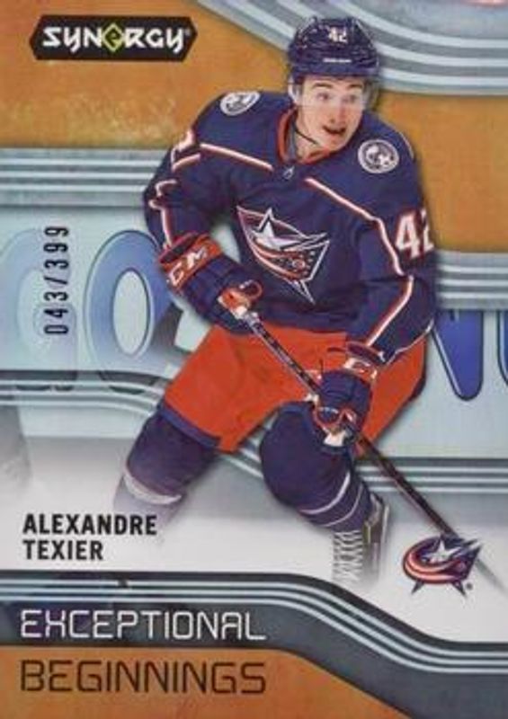 The Alexandre Texier 2019 Upper Deck Synergy #EB-6 Exceptional Beginnings Orange /399 Rookie card is 1 of 18 Alexandre Texier's card variations in the 2019 Upper Deck Synergy set being tracked by Sports Card Investor, including Base /19, Red, Red Bounty, Blue /799, and Green /299.