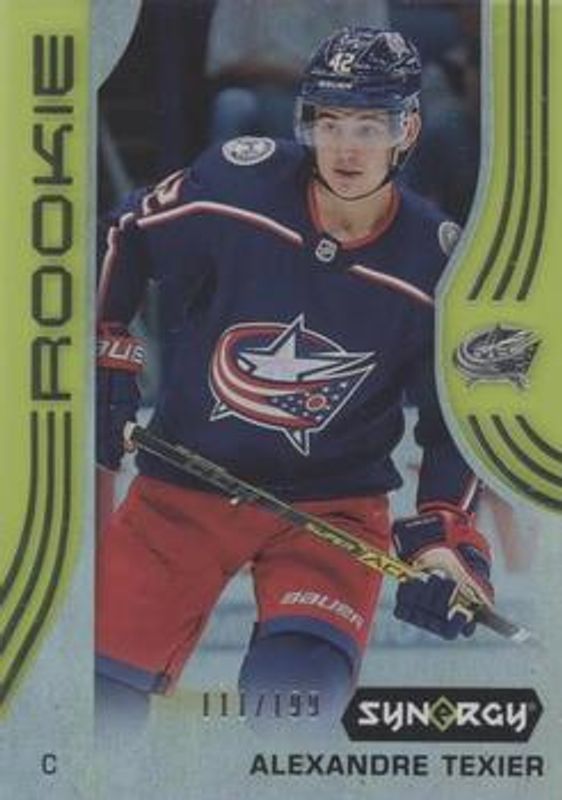 The Alexandre Texier 2019 Upper Deck Synergy #79 Green /299 Rookie card is 1 of 18 Alexandre Texier's card variations in the 2019 Upper Deck Synergy set being tracked by Sports Card Investor, including Base /19, Red, Red Bounty, Blue /799, and Purple /7.