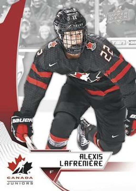The Alexis Lafreniere 2019 Upper Deck Team Canada Juniors #37 Base card is 1 of 31 Alexis Lafreniere's card variations in the 2019 Upper Deck Team Canada Juniors set being tracked by Sports Card Investor, including #115 Base, #19 Base, #19 Jersey Relics, #37 Jersey Relics, and #37 Premium Swatch Autographs /199.