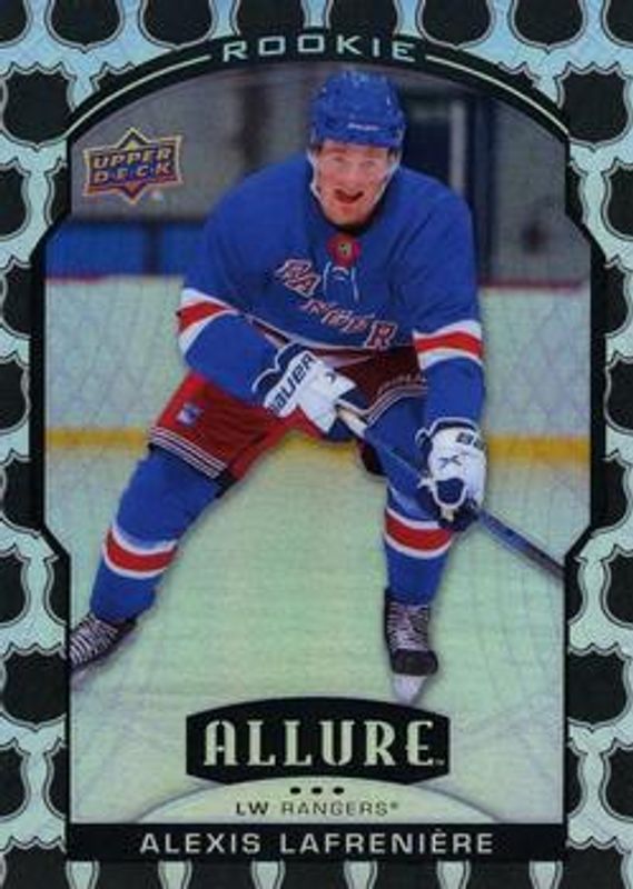 The Alexis Lafreniere 2020 Upper Deck Allure #100 2005 Shield Rookie card is 1 of 67 Alexis Lafreniere's card variations in the 2020 Upper Deck Allure set being tracked by Sports Card Investor, including #100 Base, #150 Base, #100b Base, #100 Black Rainbow, and #100 Blue China.
