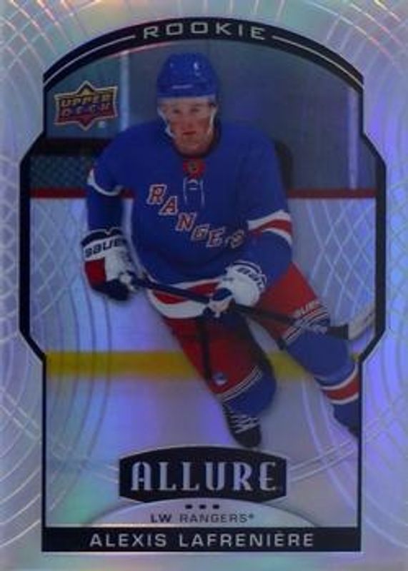 The Alexis Lafreniere 2020 Upper Deck Allure #100b Base Rookie card is 1 of 67 Alexis Lafreniere's card variations in the 2020 Upper Deck Allure set being tracked by Sports Card Investor, including #100 Base, #150 Base, #100 2005 Shield, #100 Black Rainbow, and #100 Blue China.