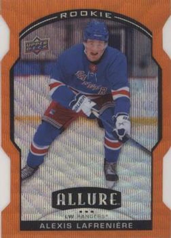 The Alexis Lafreniere 2020 Upper Deck Allure #100 Orange Slice Rookie card is 1 of 67 Alexis Lafreniere's card variations in the 2020 Upper Deck Allure set being tracked by Sports Card Investor, including #100 Base, #150 Base, #100b Base, #100 2005 Shield, and #100 Black Rainbow.