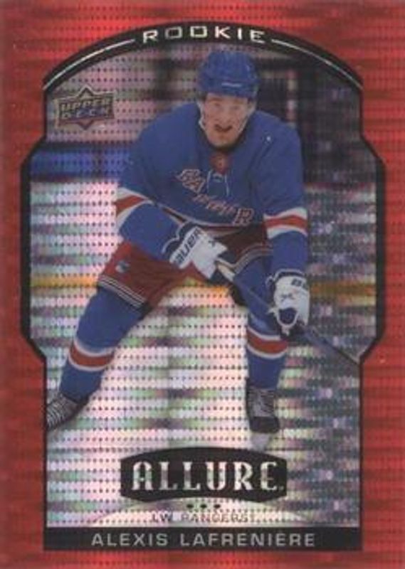 The Alexis Lafreniere 2020 Upper Deck Allure #100 Red Rainbow Rookie card is 1 of 67 Alexis Lafreniere's card variations in the 2020 Upper Deck Allure set being tracked by Sports Card Investor, including #100 Base, #150 Base, #100b Base, #100 2005 Shield, and #100 Black Rainbow.