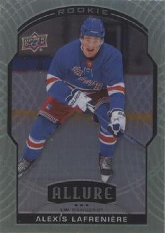 The Alexis Lafreniere 2020 Upper Deck Allure #100 Steel Rookie card is 1 of 67 Alexis Lafreniere's card variations in the 2020 Upper Deck Allure set being tracked by Sports Card Investor, including #100 Base, #150 Base, #100b Base, #100 2005 Shield, and #100 Black Rainbow.