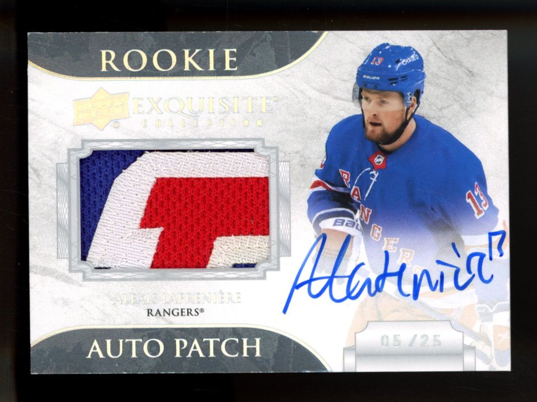 The Alexis Lafreniere 2020 Upper Deck The Cup #ECH-AL Exquisite Collection Rookie Auto Patch Horizontal /25 card is 1 of 88 Alexis Lafreniere's card variations in the 2020 Upper Deck The Cup set being tracked by Sports Card Investor, including Base /99, Artist Proof Rookie Class of 2021 Gold Foil Auto Patch, Gold Spectrum Foil /36, Gold Foil /24, and Green Foil /3.