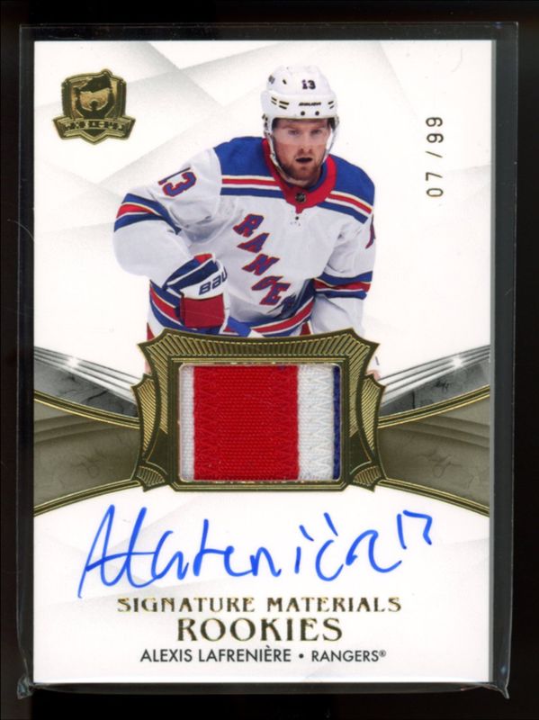 The Alexis Lafreniere 2020 Upper Deck The Cup #SP-AL Signatures Materials /99 Rookie card is 1 of 88 Alexis Lafreniere's card variations in the 2020 Upper Deck The Cup set being tracked by Sports Card Investor, including Base /99, Artist Proof Rookie Class of 2021 Gold Foil Auto Patch, Gold Spectrum Foil /36, Gold Foil /24, and Green Foil /3.