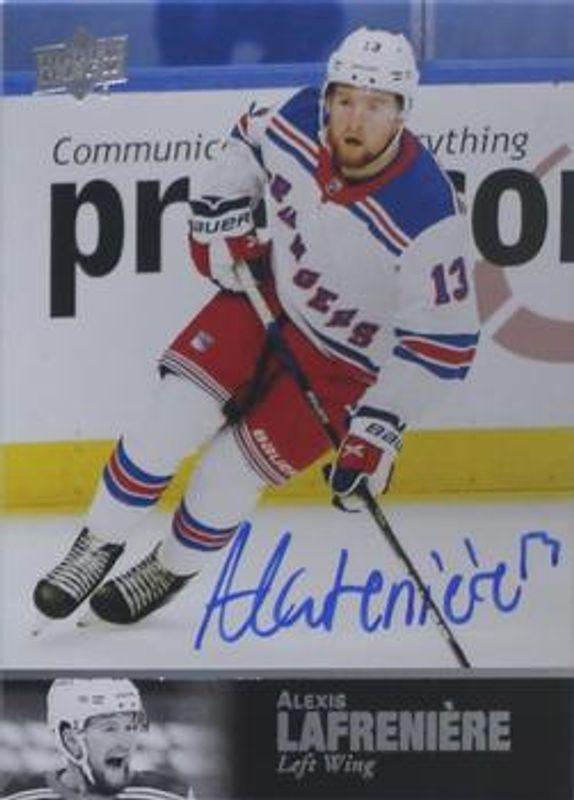 The Alexis Lafreniere 2020 Upper Deck Ultimate Collection #AL-172 1997 Ultimate Legends Signatures Rookie card is 1 of 44 Alexis Lafreniere's card variations in the 2020 Upper Deck Ultimate Collection set being tracked by Sports Card Investor, including Base /299, Ultimate Rookies Jersey /649, Ultimate Rookies Autographed Patch /99, Jumbo Patch /15, and Shield Patch /1.