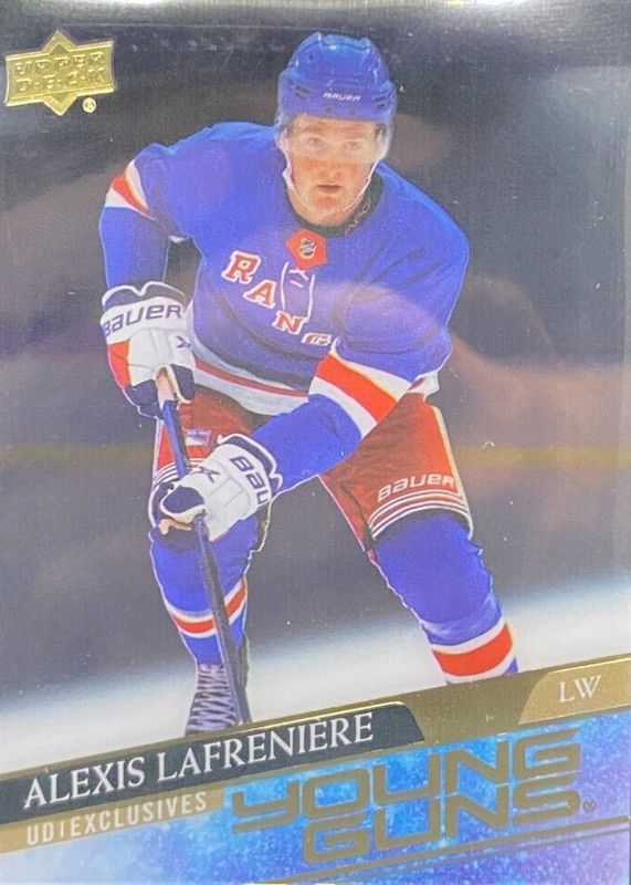 This card is 1 of 14 Alexis Lafreniere's card variations in the 2020 Upper Deck set being tracked by Sports Card Investor, including Young Guns Base, Young Guns Canvas, Young Guns - Clear Cut, Young Guns - French, and Young Guns - Jumbo.