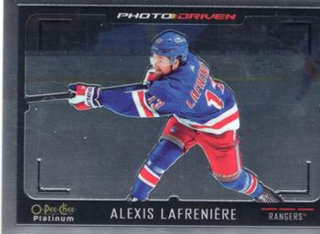 The Alexis Lafreniere 2021 O-Pee-Chee Platinum #PD-2 Photo Driven card is 1 of 32 Alexis Lafreniere's card variations in the 2021 O-Pee-Chee Platinum set being tracked by Sports Card Investor, including Base, Blue Surge, Matte Pink, Neon Yellow Surge, and Rainbow.