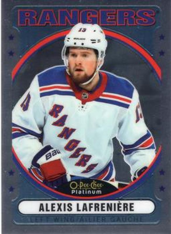 The Alexis Lafreniere 2021 O-Pee-Chee Platinum #R-61 Retro card is 1 of 32 Alexis Lafreniere's card variations in the 2021 O-Pee-Chee Platinum set being tracked by Sports Card Investor, including Base, Blue Surge, Matte Pink, Neon Yellow Surge, and Rainbow.
