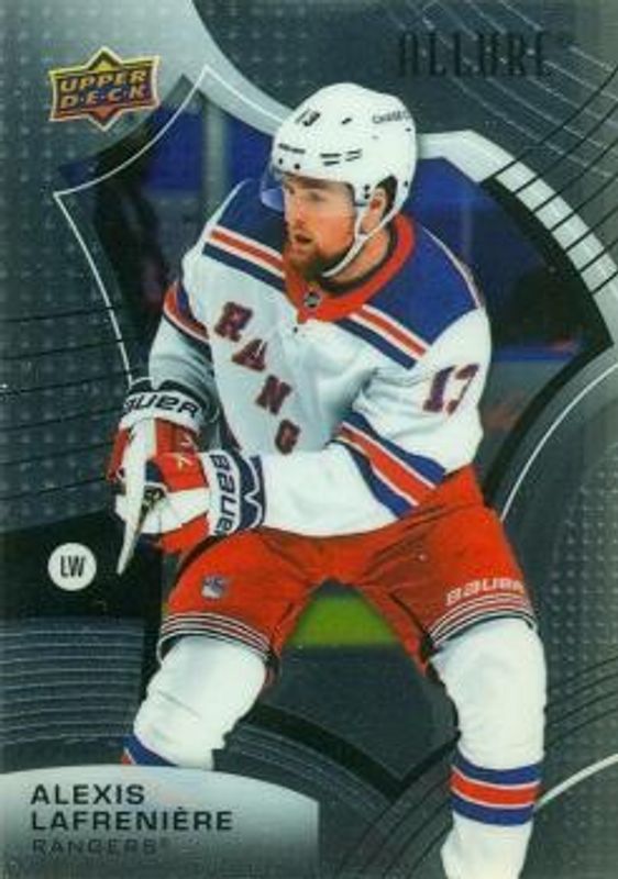 The Alexis Lafreniere 2021 Upper Deck Allure #59 Base card is 1 of 40 Alexis Lafreniere's card variations in the 2021 Upper Deck Allure set being tracked by Sports Card Investor, including Black Rainbow, Blue China, Orange Slice die-cut, Pink Blue Leopard, and Red Rainbow.