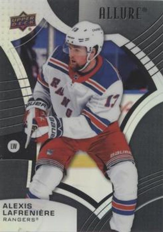 The Alexis Lafreniere 2021 Upper Deck Allure #59 Black Rainbow card is 1 of 40 Alexis Lafreniere's card variations in the 2021 Upper Deck Allure set being tracked by Sports Card Investor, including Base, Blue China, Orange Slice die-cut, Pink Blue Leopard, and Red Rainbow.