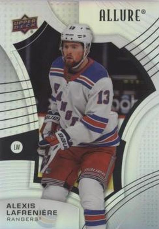 The Alexis Lafreniere 2021 Upper Deck Allure #59 Photo Variation card is 1 of 40 Alexis Lafreniere's card variations in the 2021 Upper Deck Allure set being tracked by Sports Card Investor, including Base, Black Rainbow, Blue China, Orange Slice die-cut, and Pink Blue Leopard.