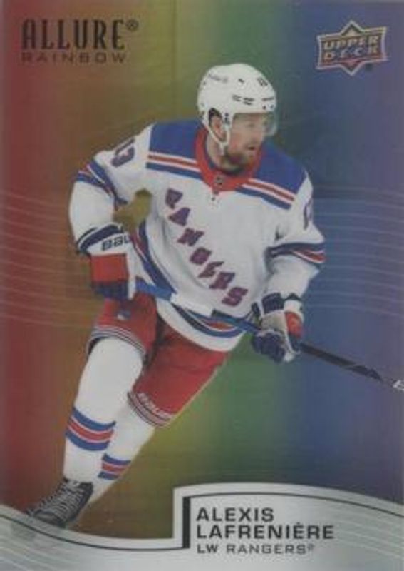 The Alexis Lafreniere 2021 Upper Deck Allure #R-53 Rainbow - Double Rainbow card is 1 of 40 Alexis Lafreniere's card variations in the 2021 Upper Deck Allure set being tracked by Sports Card Investor, including Base, Black Rainbow, Blue China, Orange Slice die-cut, and Pink Blue Leopard.
