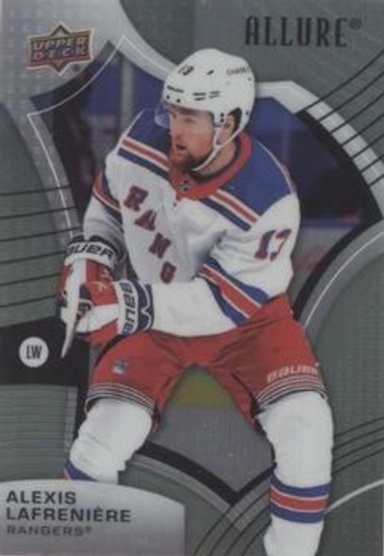 The Alexis Lafreniere 2021 Upper Deck Allure #59 Steel card is 1 of 40 Alexis Lafreniere's card variations in the 2021 Upper Deck Allure set being tracked by Sports Card Investor, including Base, Black Rainbow, Blue China, Orange Slice die-cut, and Pink Blue Leopard.
