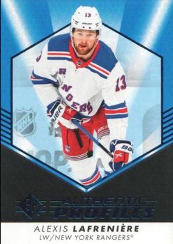 The Alexis Lafreniere 2022 SP #AP-13 Authentic Profiles - Blue card is 1 of 15 Alexis Lafreniere's card variations in the 2022 SP set being tracked by Sports Card Investor, including Base /399, Blue, Authentic Profiles Jersey, Authentic Profiles - Patterned Foilboard, and Authentic Profiles - Patterned Foilboard Gold.