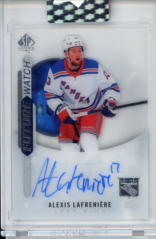 The Alexis Lafreniere 2022 Upper Deck Clear Cut #RA-AL 2022 Tribute Autos Rookies card is 1 of 9 Alexis Lafreniere's card variations in the 2022 Upper Deck Clear Cut set being tracked by Sports Card Investor, including 2021 Champs, 2021 Tribute Autos Rookies, 2021 Vintage Views, 2021 Canvas Signatures /25, and 2021 Champs - Green /25.