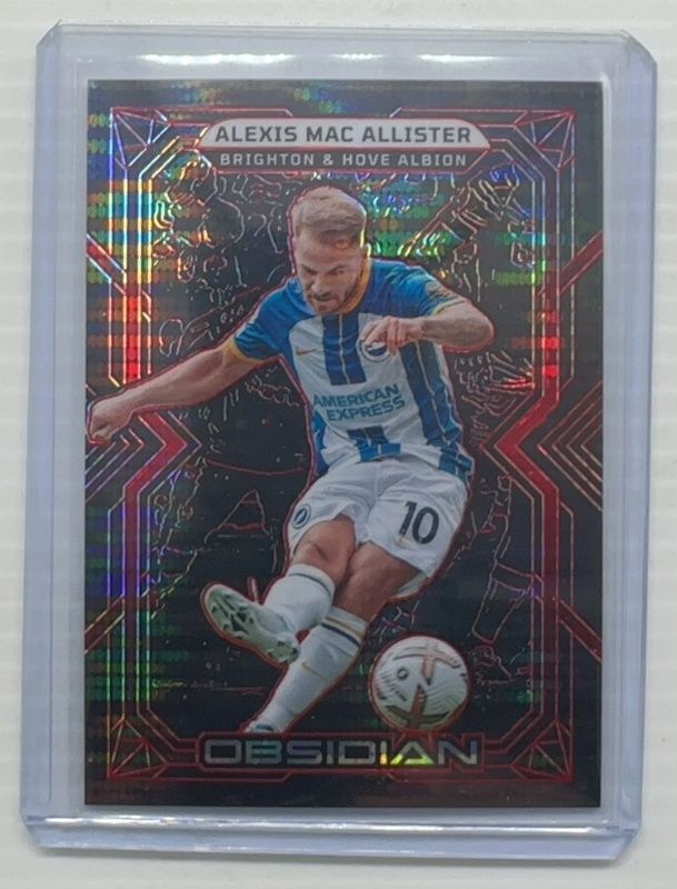 The Alexis Mac Allister 2022 Obsidian #26 Electric Etch Red Pulsar /30 card is 1 of 24 Alexis Mac Allister's card variations in the 2022 Obsidian set being tracked by Sports Card Investor, including Base /115, Electric Etch Orange /40, Electric Etch Purple Flood /25, Electric Etch Blue /20, and Electric Etch Neon Blue Flood /12.
