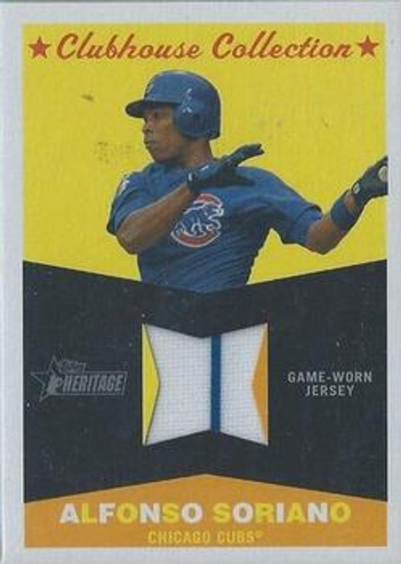 The Alfonso Soriano 2009 Topps Heritage #CC-AS Clubhouse Collection Relics card is 1 of 6 Alfonso Soriano's card variations in the 2009 Topps Heritage set being tracked by Sports Card Investor, including Base, Chrome /1960, Chrome Refractor /560, Chrome Refractor Black /60, and Mayo (Target).