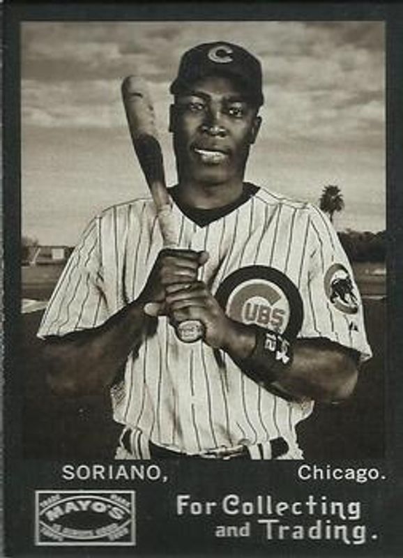 The Alfonso Soriano 2009 Topps Heritage #TME-AS Mayo (Target) card is 1 of 6 Alfonso Soriano's card variations in the 2009 Topps Heritage set being tracked by Sports Card Investor, including Base, Chrome /1960, Chrome Refractor /560, Chrome Refractor Black /60, and Clubhouse Collection Relics.