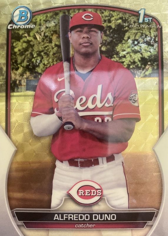 This card is 1 of 44 Alfredo Duno's card variations in the 2023 Bowman Chrome set being tracked by Sports Card Investor, including Prospects (1st), Prospects - Pearl Refractor (1st), Prospects - Shimmer Refractor (1st), Prospects - Refractor /499 (1st), and Prospects - Speckle Refractor /299 (1st).