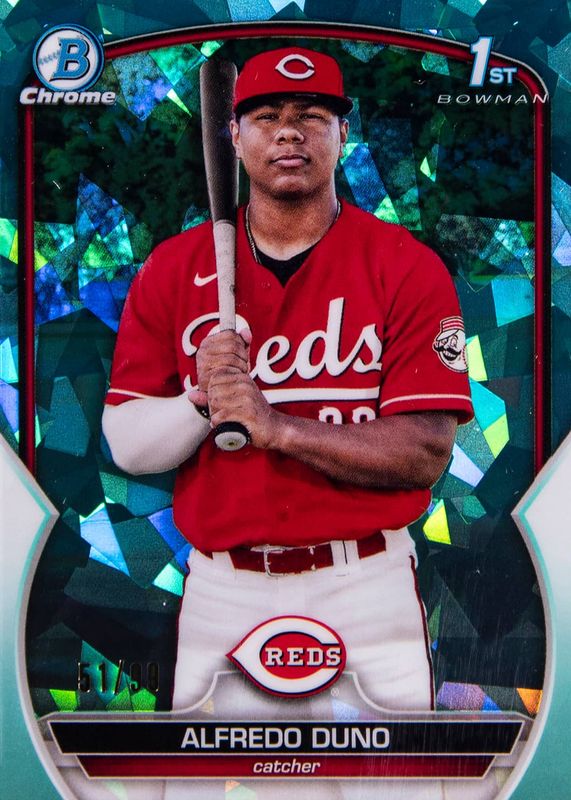 This card is 1 of 7 Alfredo Duno's card variations in the 2023 Bowman Chrome Sapphire Edition set being tracked by Sports Card Investor, including Prospects (1st), Prospects - Orange /75 (1st), Prospects - Yellow /50 (1st), Prospects - Purple /25 (1st), and Prospects - Red /5 (1st).