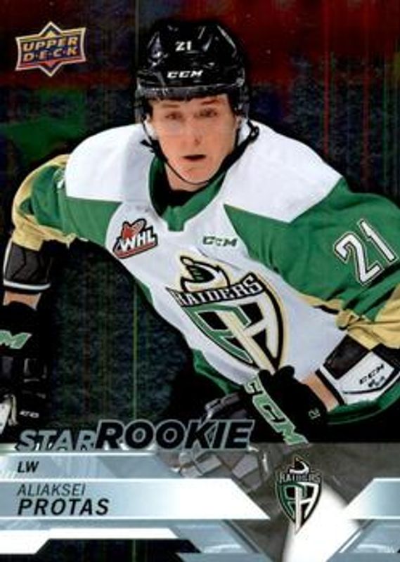 The Aliaksei Protas 2018 Upper Deck CHL #329 Silver card is 1 of 9 Aliaksei Protas' card variations in the 2018 Upper Deck CHL set being tracked by Sports Card Investor, including Base, Star Rookies UD Exclusives /100, Star Rookies Midnight /25, Star Rookies High Gloss /10, and Printing Plates Black /1.