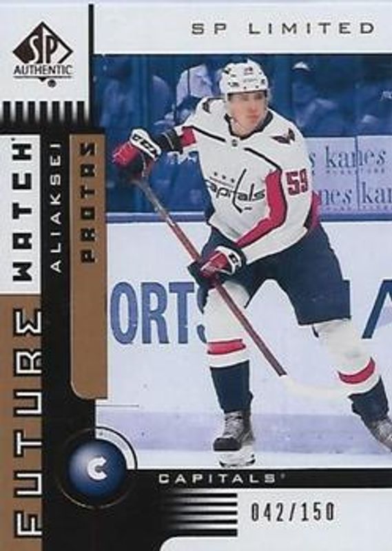 The Aliaksei Protas 2021 SP Authentic #01FW-AP 2001 Retro Future Watch Limited /150 Rookie card is 1 of 14 Aliaksei Protas' card variations in the 2021 SP Authentic set being tracked by Sports Card Investor, including Black Autographs, Limited Red, Limited Gold /99, Future Watch Inscribed /50, and Limited Black /1.