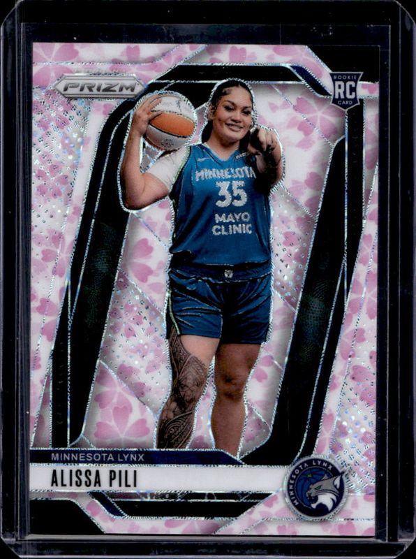 The Alissa Pili 2024 Prizm WNBA #150 Cherry Blossom FOTL /20 Rookie card is 1 of 110 Alissa Pili's card variations in the 2024 Prizm WNBA set being tracked by Sports Card Investor, including #83 Base, #150 Base, #150 Rookie Variation, #150 Blue Velocity, and #83 Blue Velocity.