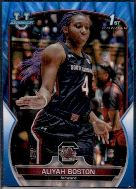 The Aliyah Boston 2022 Bowman Chrome University #5 Blue RayWave Refractor /199 card is 1 of 47 Aliyah Boston's card variations in the 2022 Bowman Chrome University set being tracked by Sports Card Investor, including Base, Pink Refractor, Purple Shimmer Refractor, Refractor, and Shimmer Refractor.