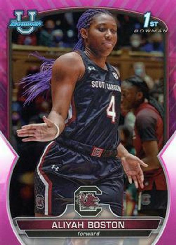The Aliyah Boston 2022 Bowman Chrome University #5 Pink Refractor card is 1 of 47 Aliyah Boston's card variations in the 2022 Bowman Chrome University set being tracked by Sports Card Investor, including Base, Purple Shimmer Refractor, Refractor, Shimmer Refractor, and Purple Mini-Diamond Refractor /399.