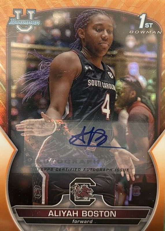 Best Prices Available For Sale of Aliyah Boston 2022 Bowman Chrome University #5 Prospect Autographs - Orange Shimmer Refractor /25 (1st)