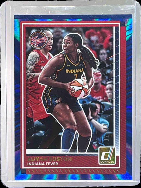The Aliyah Boston 2025 Donruss WNBA #1 Blue Laser /49 card is 1 of 76 Aliyah Boston's card variations in the 2025 Donruss WNBA set being tracked by Sports Card Investor, including Base, Cubic, Dragon, Green Laser, and Green Shimmer.