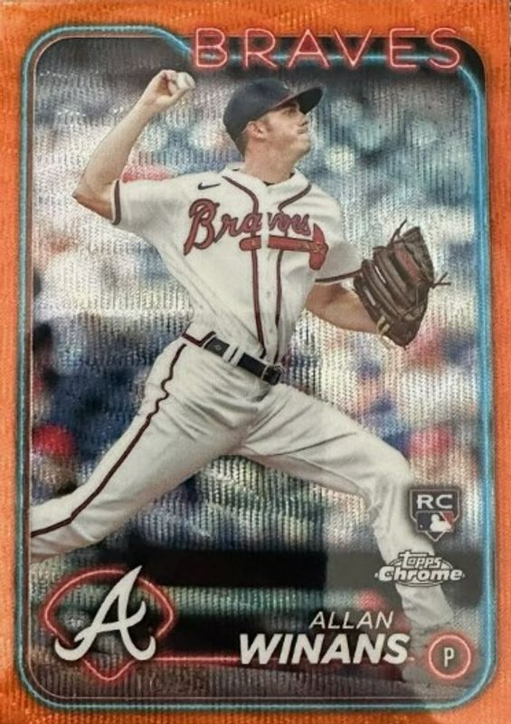 The Allan Winans 2024 Topps Chrome #249 Orange Wave Refractor /25 Rookie card is 1 of 15 Allan Winans' card variations in the 2024 Topps Chrome set being tracked by Sports Card Investor, including Base, Pink Refractor, Aqua RayWave Refractor /199, Aqua Refractor /199, and Blue RayWave Refractor /150.