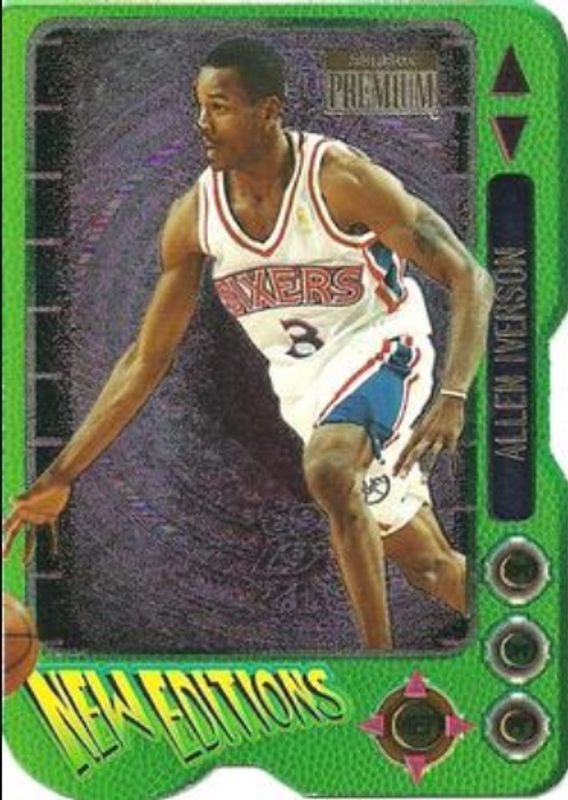 The Allen Iverson 1996 Skybox Premium #5 New Editions Rookie card is 1 of 10 Allen Iverson's card variations in the 1996 Skybox Premium set being tracked by Sports Card Investor, including #216 Base, #85 Base, #216 Rookies, #216 Star Rubies, and #85 Star Rubies.